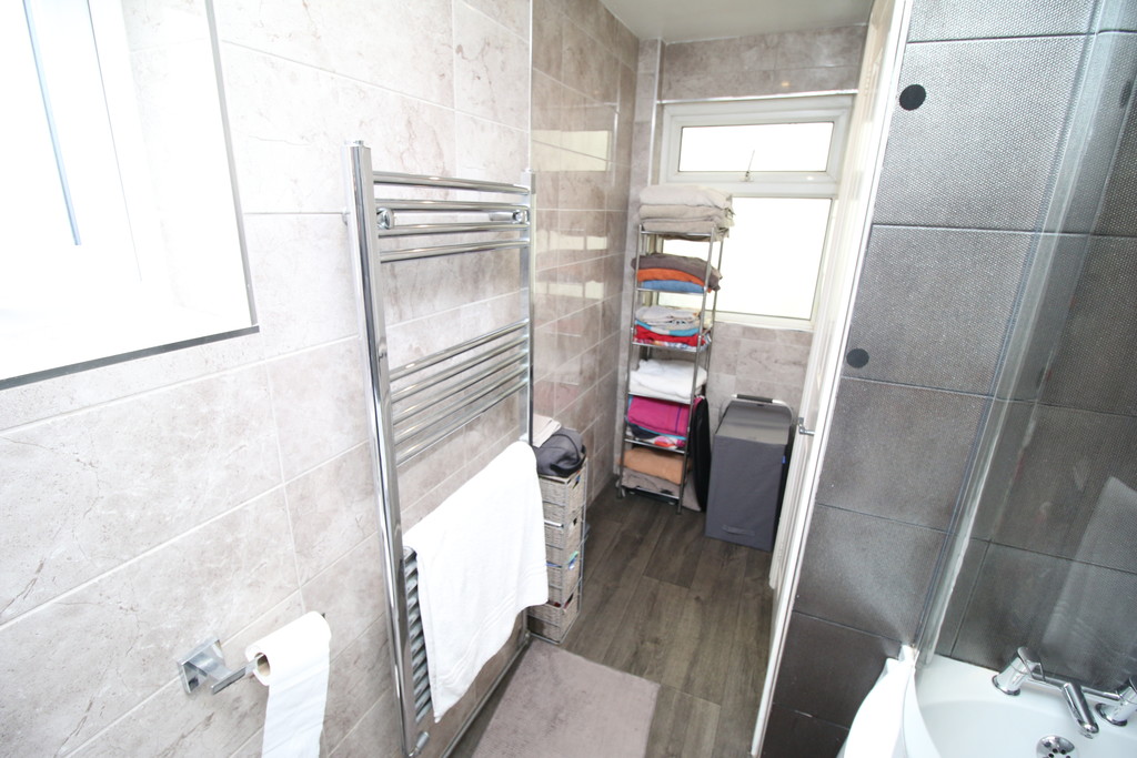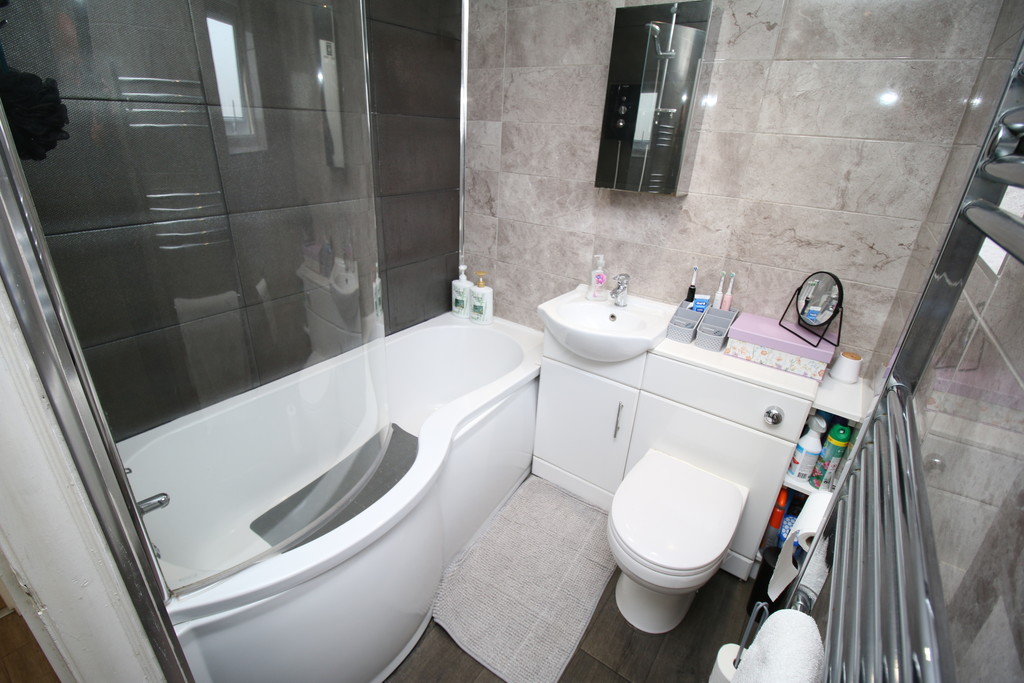 BATHROOM With frosted UPVC double glazed windows to rear and side aspects, heated chrome towel rail. Bathroom suite comprising panelled bath with shower over, low level WC, wash basin set in vanity cupboard, extractor fan, tiled floor to ceiling.