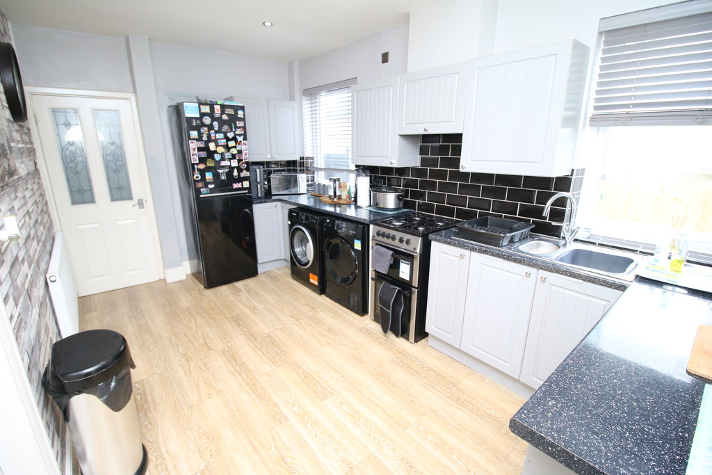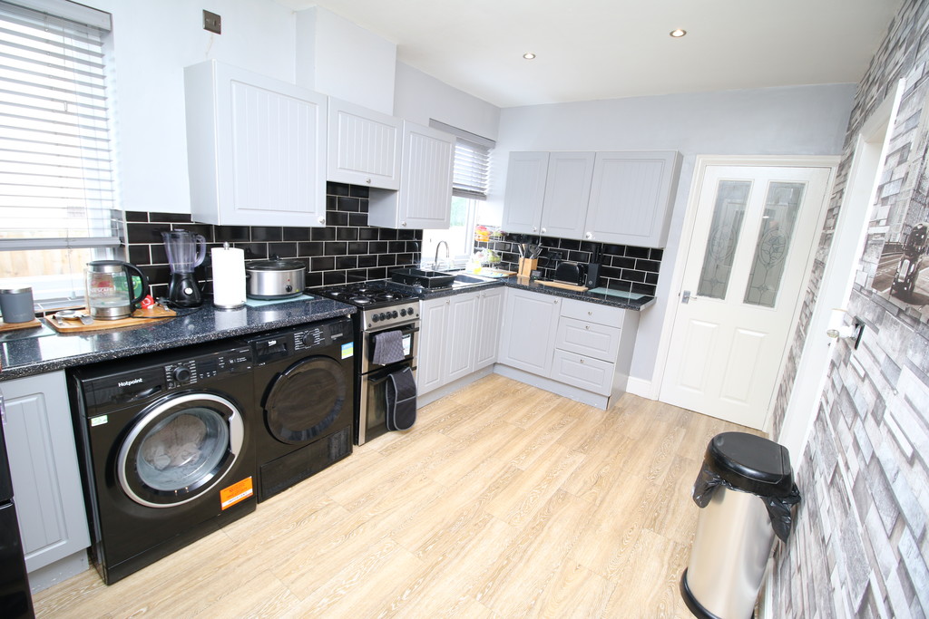 KITCHEN 15' 1" x 8' 9" (4.6m x 2.67m) With UPVC double glazed windows to side aspect, panel radiator. Kitchen comes with a range of wall and base units with roll top work surfaces, inset one and a half bowl stainless sink and drainage unit. Plumbing for washing machine, and space for dryer and fridge freezer. Door to;